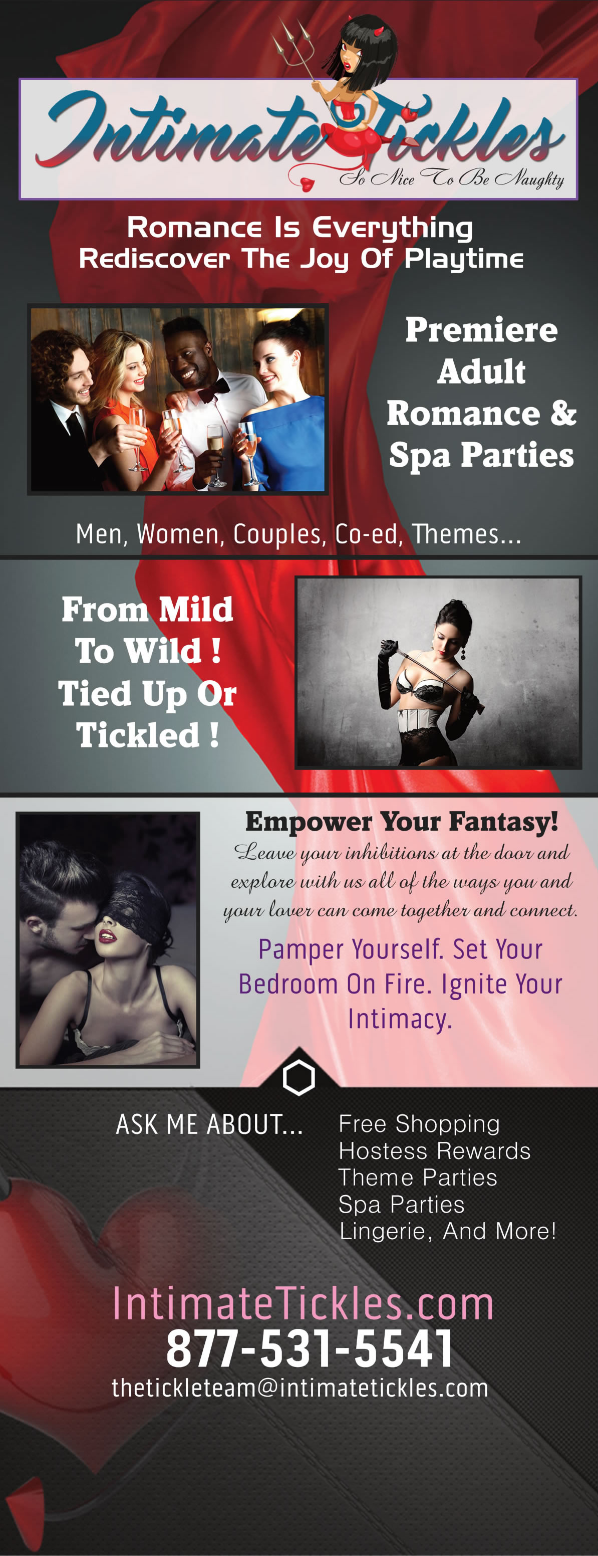 Our Mission: At Intimate Tickles, it’s not just that we love what we do; it’s what we do for you that keep us motivated to improve. Our mission has always been to empower people and to give everyone a safe environment to learn about sexual health, enhancement, and to give them the permission to learn new ways to take their relationship beyond boundaries, strengthen the romance, and to encourage open communication. It’s these goals that have made Intimate Tickles one of the premiere adult toy & romance party companies in the industry.